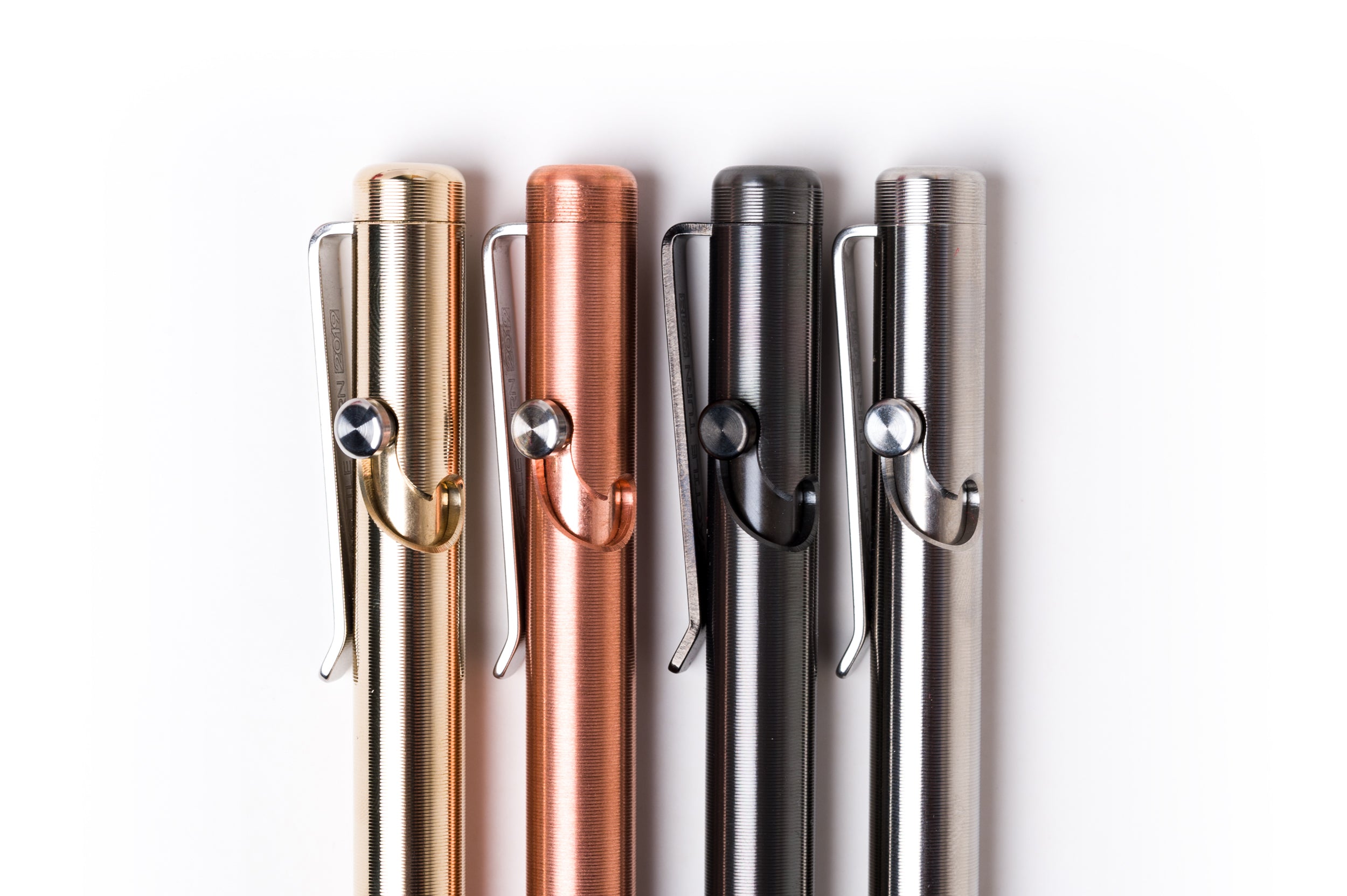 Once you decide on the model, it's time to pick a premium material. There's no right or wrong but, when people ask us about their first pen, we recommend Titanium because it's lightweight, strong, and maintains a consistent look over time. We love playing with finishes and trying new materials but Titanium, Copper, and Bronze are our core offerings due to their popularity and machinability.