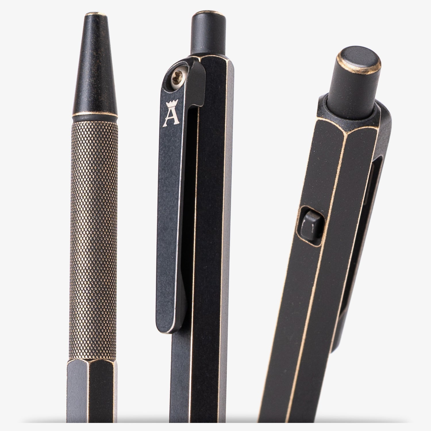 While it may resemble our typical Side Click models, the Ansø pens feature a special, slimmed-down version of the mechanism to fit the even "slimmer than slim" body diameter. The knurled grip and hexagonal body sections are new additions to our catalog which required using new (to us) tools and plenty of trial-and-error. One immediately obvious change is the side button to retract the ink refill is located on the opposite side of the clip.
