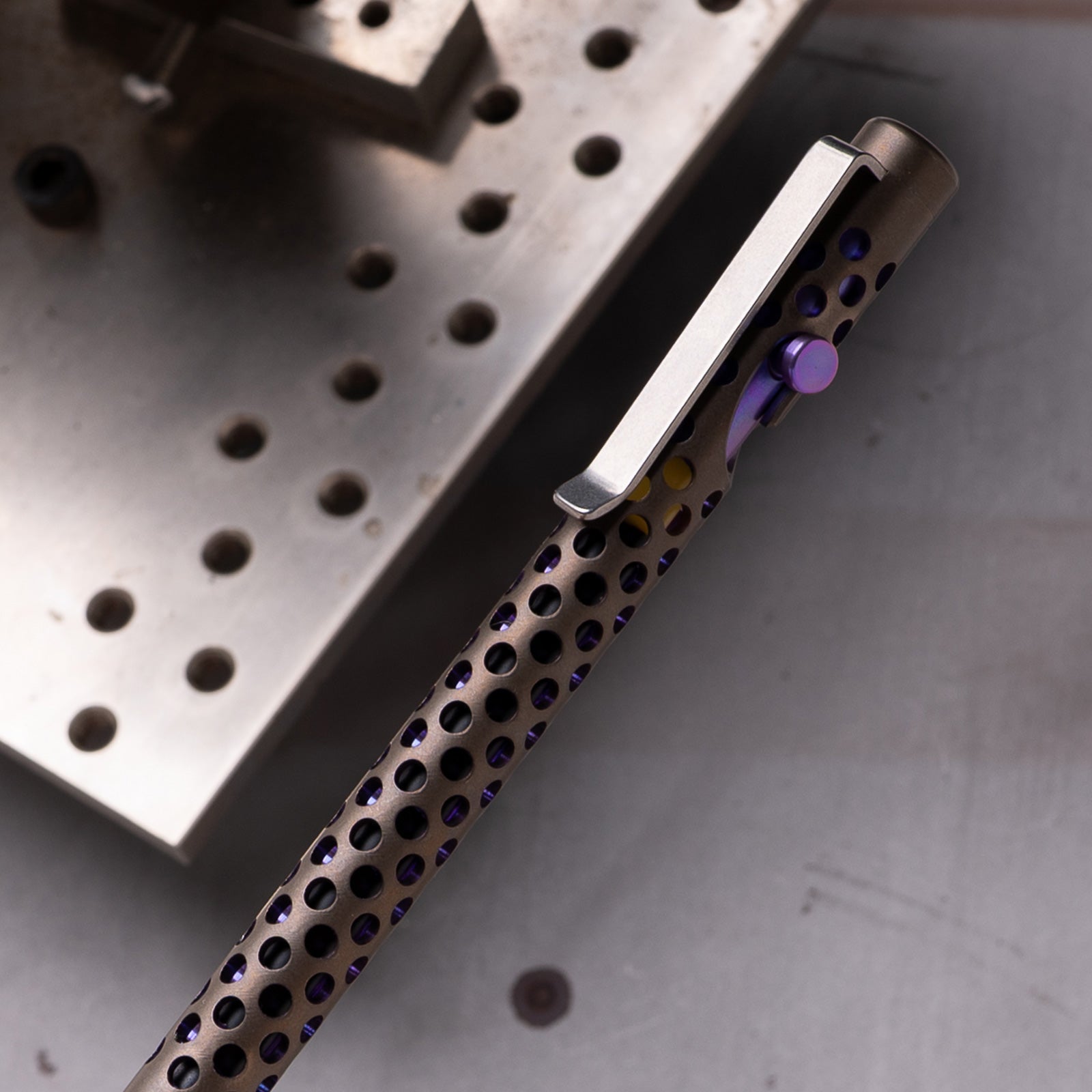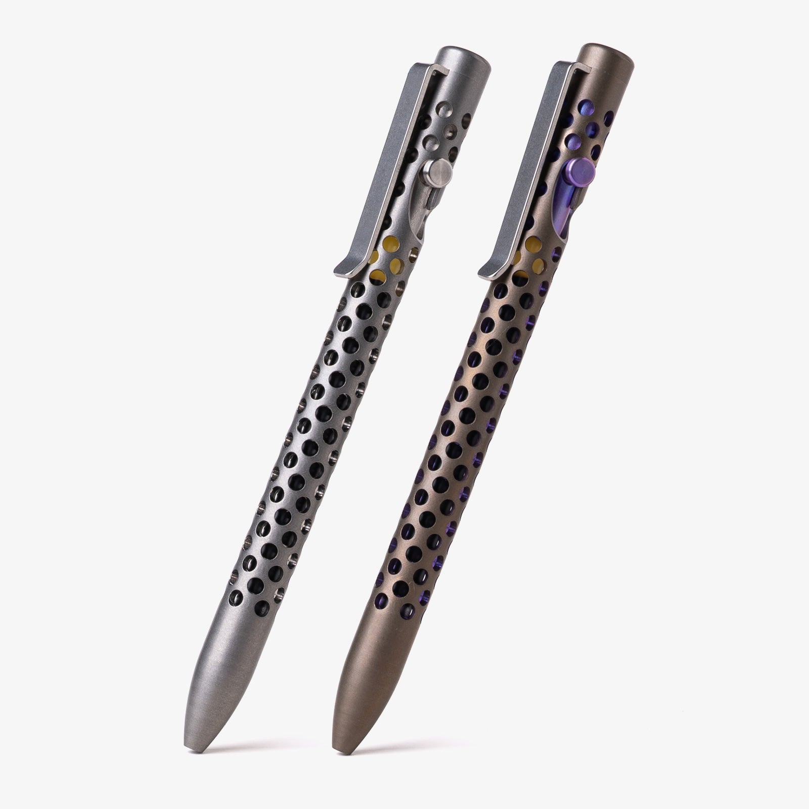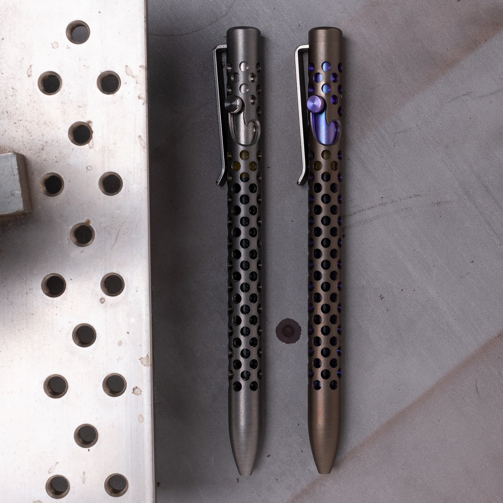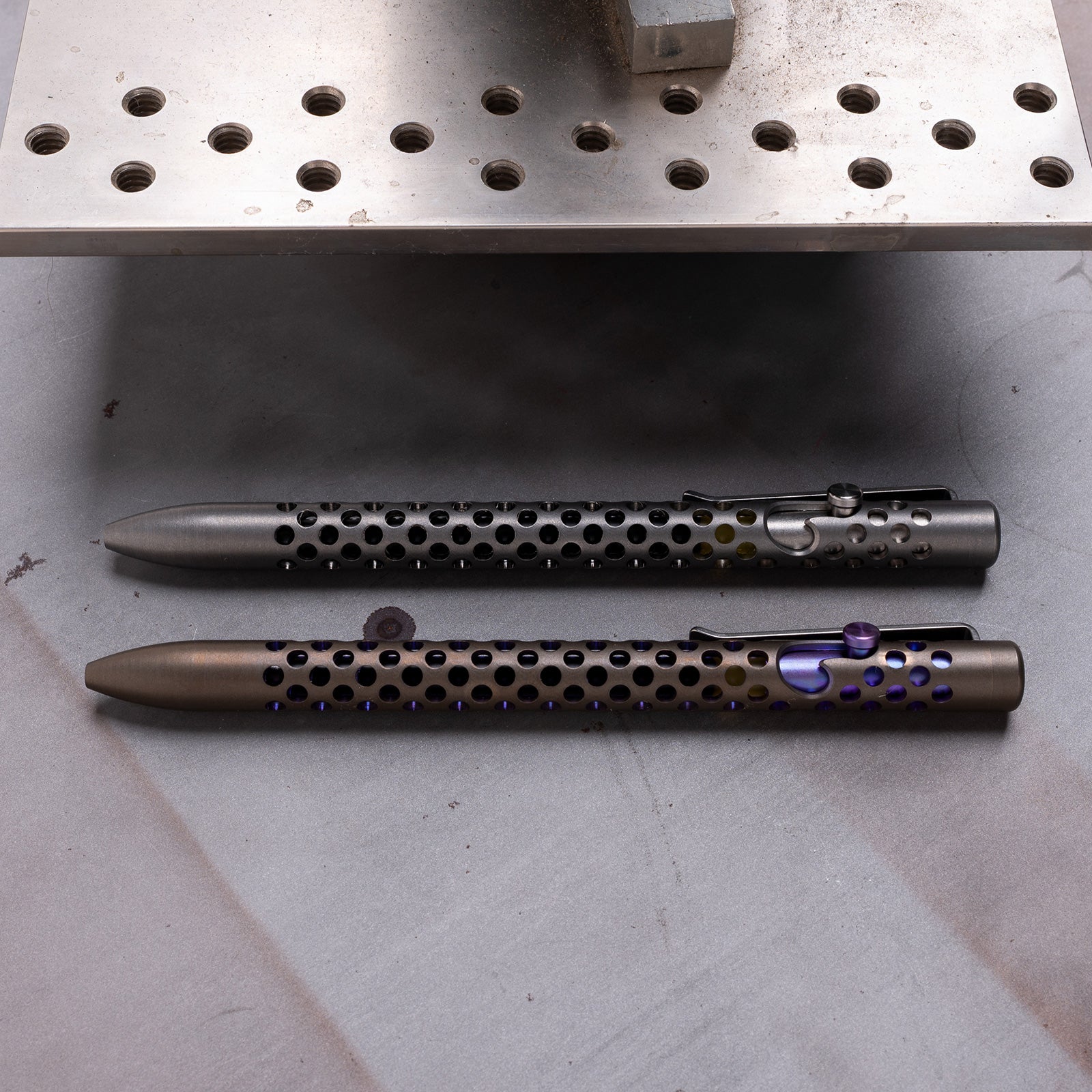After introducing the Aluminum Skeletonized Bolt Actions earlier this year the response was clear: do it in titanium. So we did. Each pen sports over 150 holes to reduce weight and show the internal workings. Available in a Dual Tone Anodized purple/bronze finish or our classic Stonewash while supplies last.