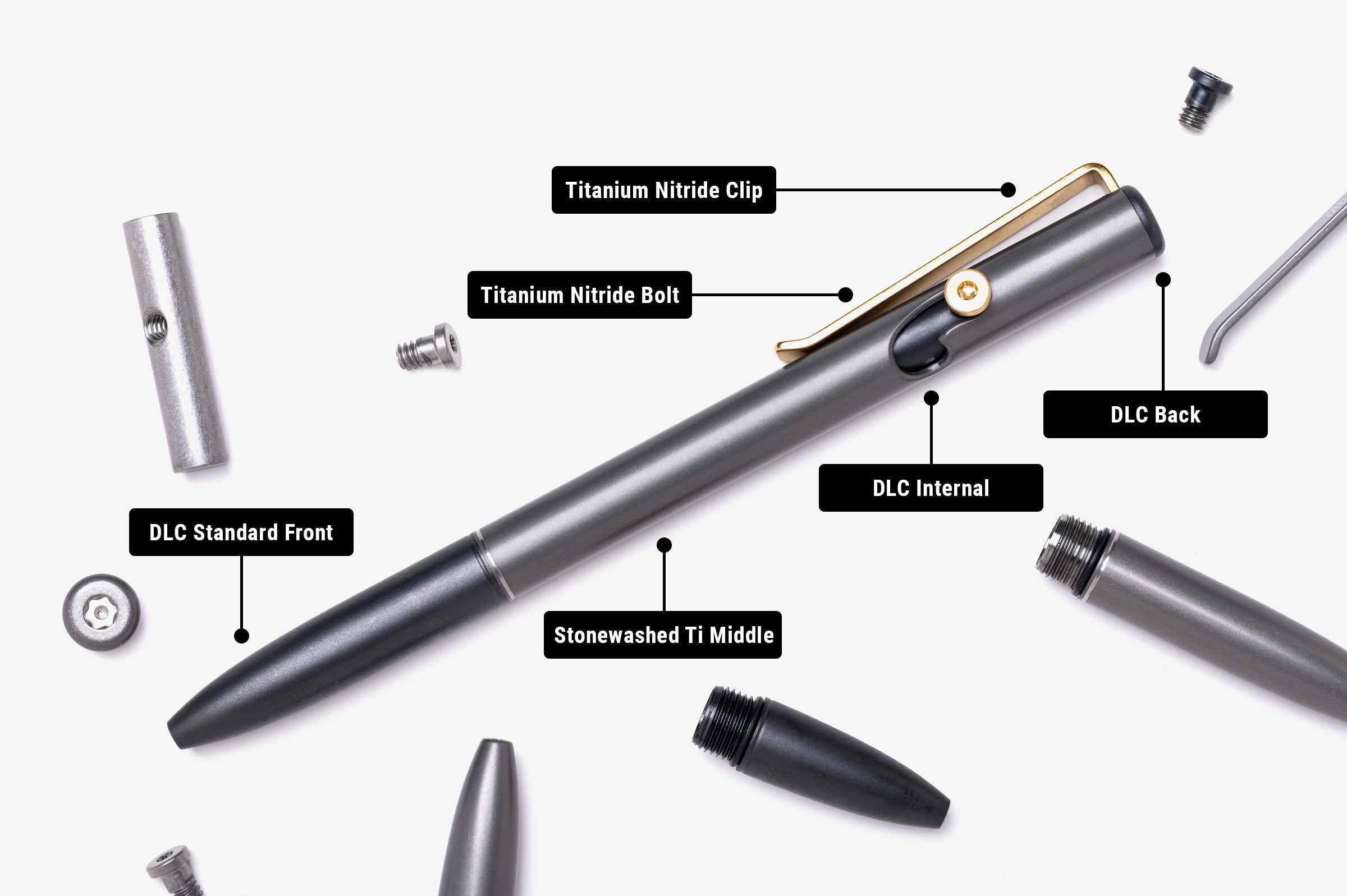 Available (for now) in stonewashed titanium and black DLC base pen with a kicker of Titanium Nitride gold bolts and clips in the Smooth Operator Parts Collection →